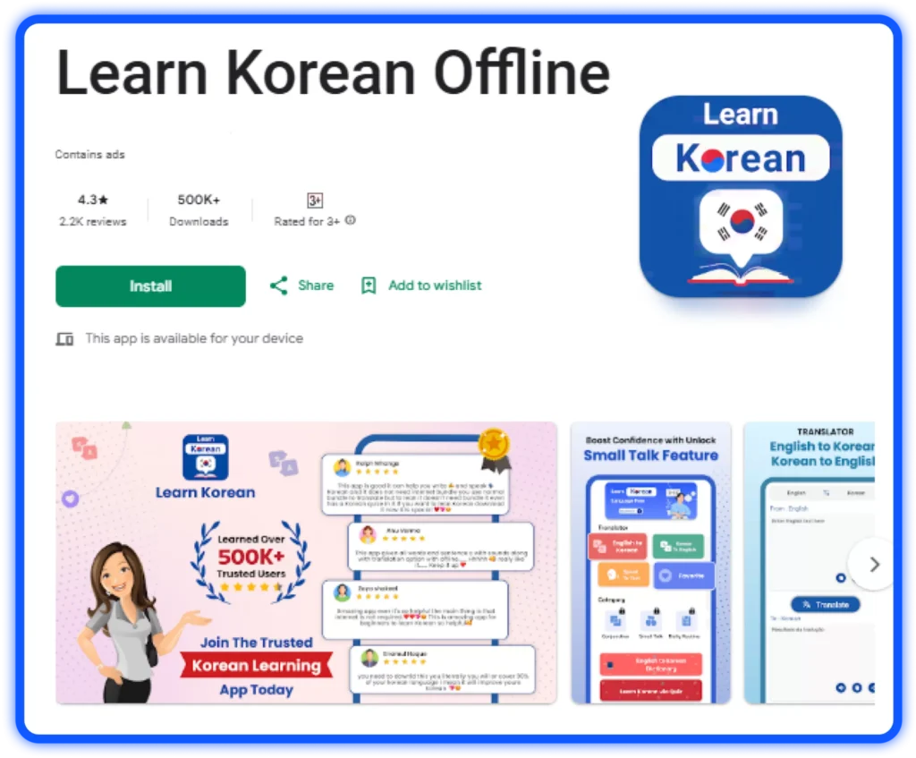Our “Learn Korean Offline” app solves common language-learning problems with ease. It offers short lessons to fit your busy schedule, and no internet is needed, so you can learn anywhere. The app’s interactive quizzes, mini-games, and visual tools make learning fun and engaging. You’ll also find a Korean phrasebook and audio guides to help with real-life communication. Plus, you can track your progress daily to stay motivated as you master Korean quickly and stress-free!